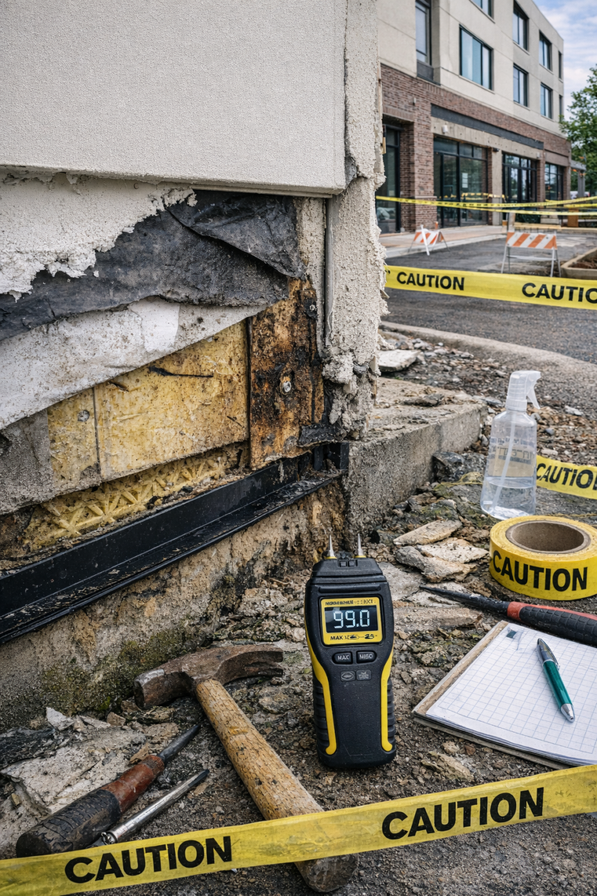 Specifying the correct drainage mat and detailing the terminations correctly on paper is necessary but not sufficient. Failures in the Charlotte building described above were entirely preventable with a targeted inspection protocol at three specific milestones: after WRB installation and before EPS board attachment, after EPS board attachment and before base coat application and after base coat application at termination locations accessible for probe testing.