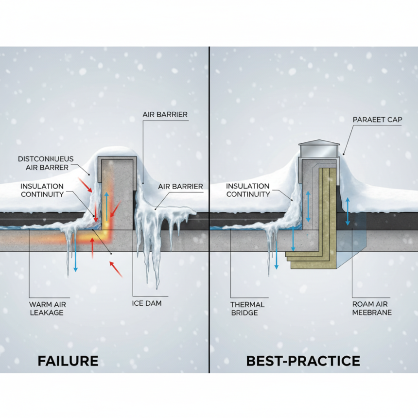 Ice dams disproportionately originate at roof-to-wall transitions because these locations concentrate air leakage, thermal bridging, and cold exposure. Parapets, in particular, represent the highest-risk condition due to their geometry and detailing demands.